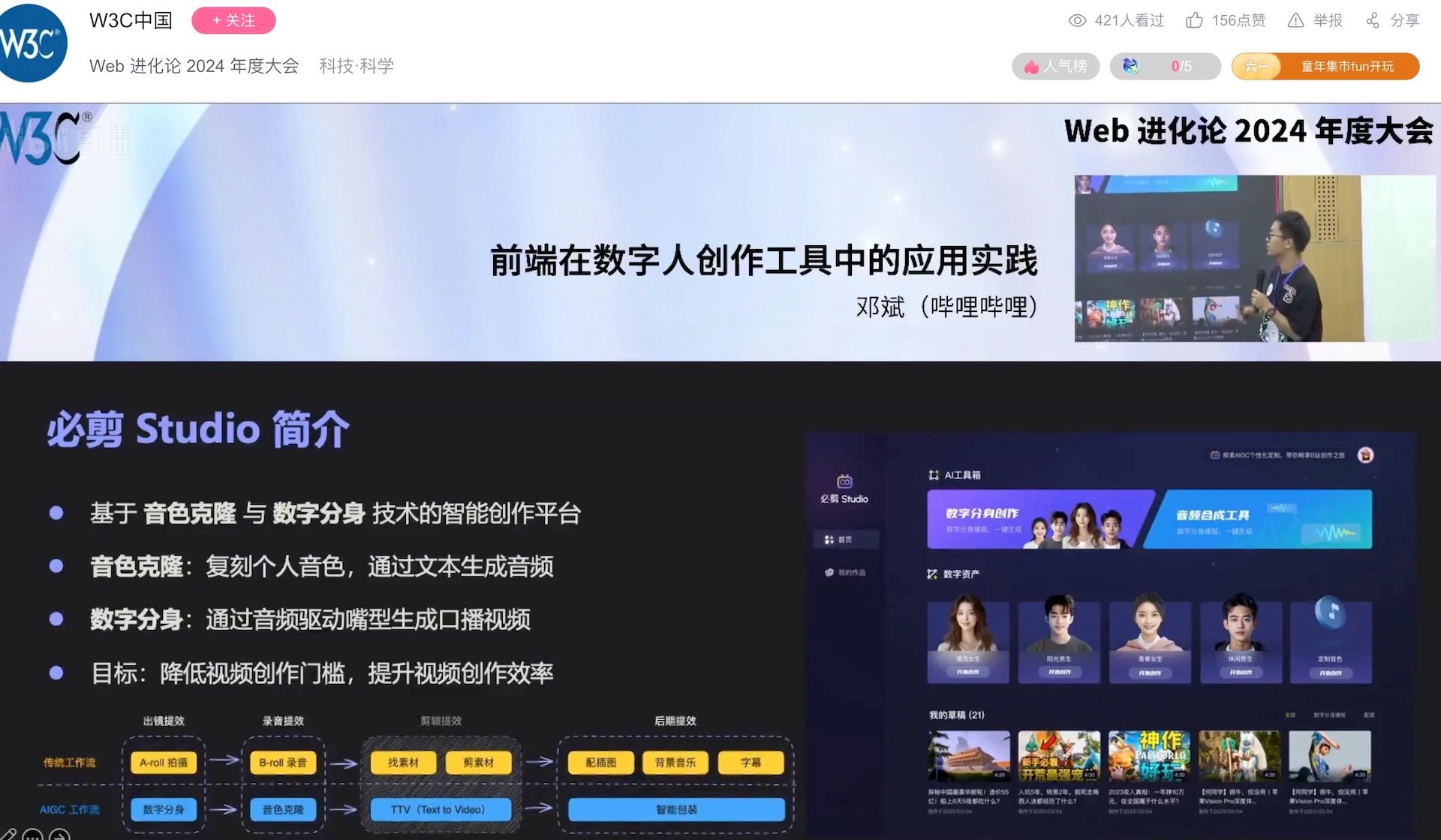 今年的 W3C·Web 进化论是由 B 站承办的,公司有几个分享名额,我有幸分享了团队在数字人领域的一些探索和实践。
