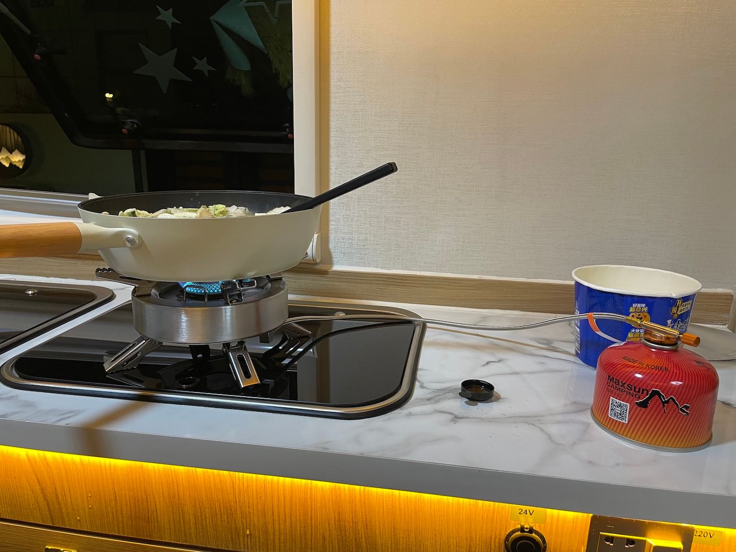 房车里设施齐全,还带了灶台,不过我们自己也带了一个炉子,煮了一顿泡面火锅,还煮了茶,非常有意思。这个炉子和茶壶买来第一次用,特别喜欢,而且炉子是折叠的,特方便。以后的露营或者自驾游都会带上,非常实用。希望能用很多年。